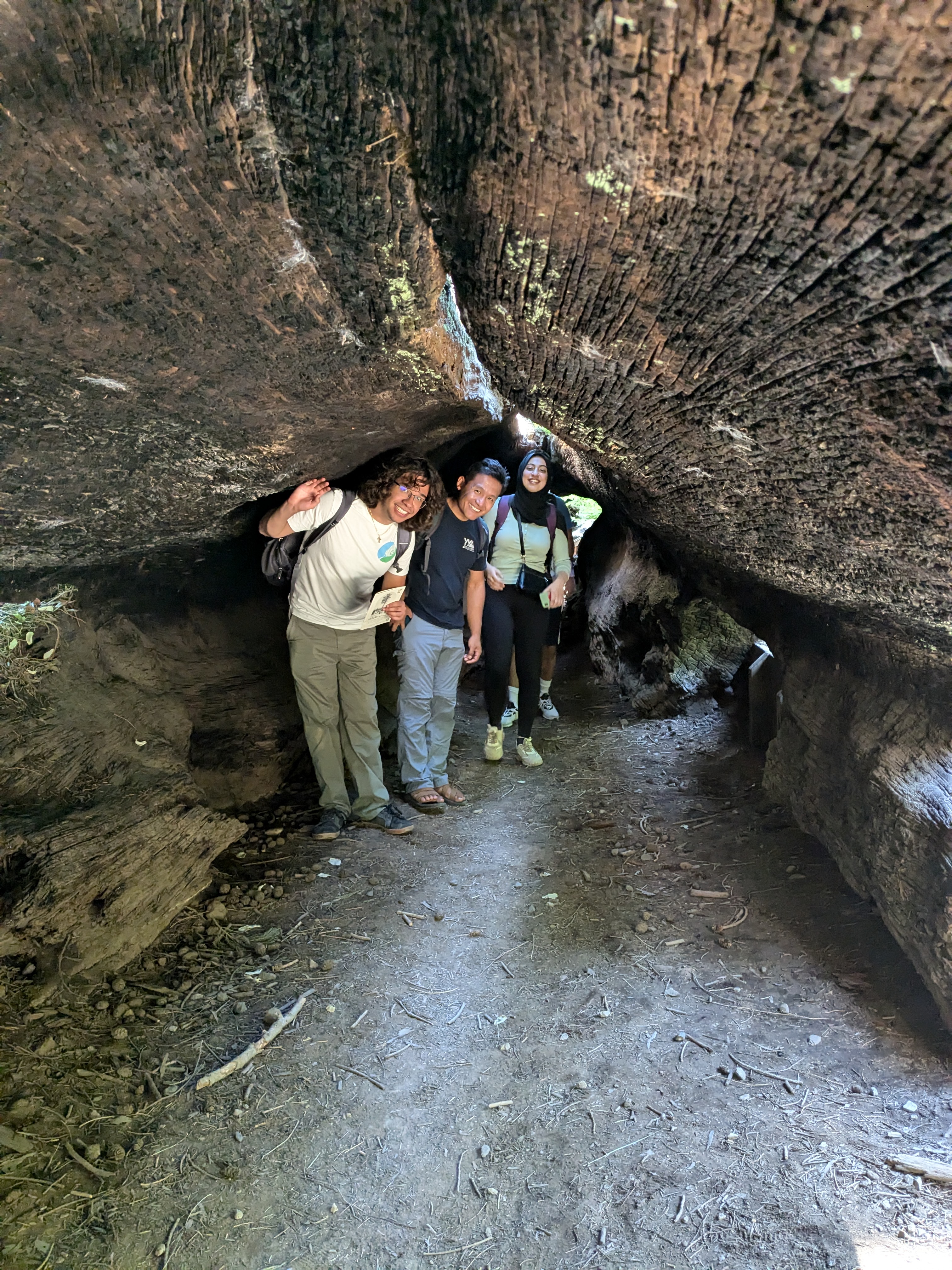 Students within a fallen sequoia